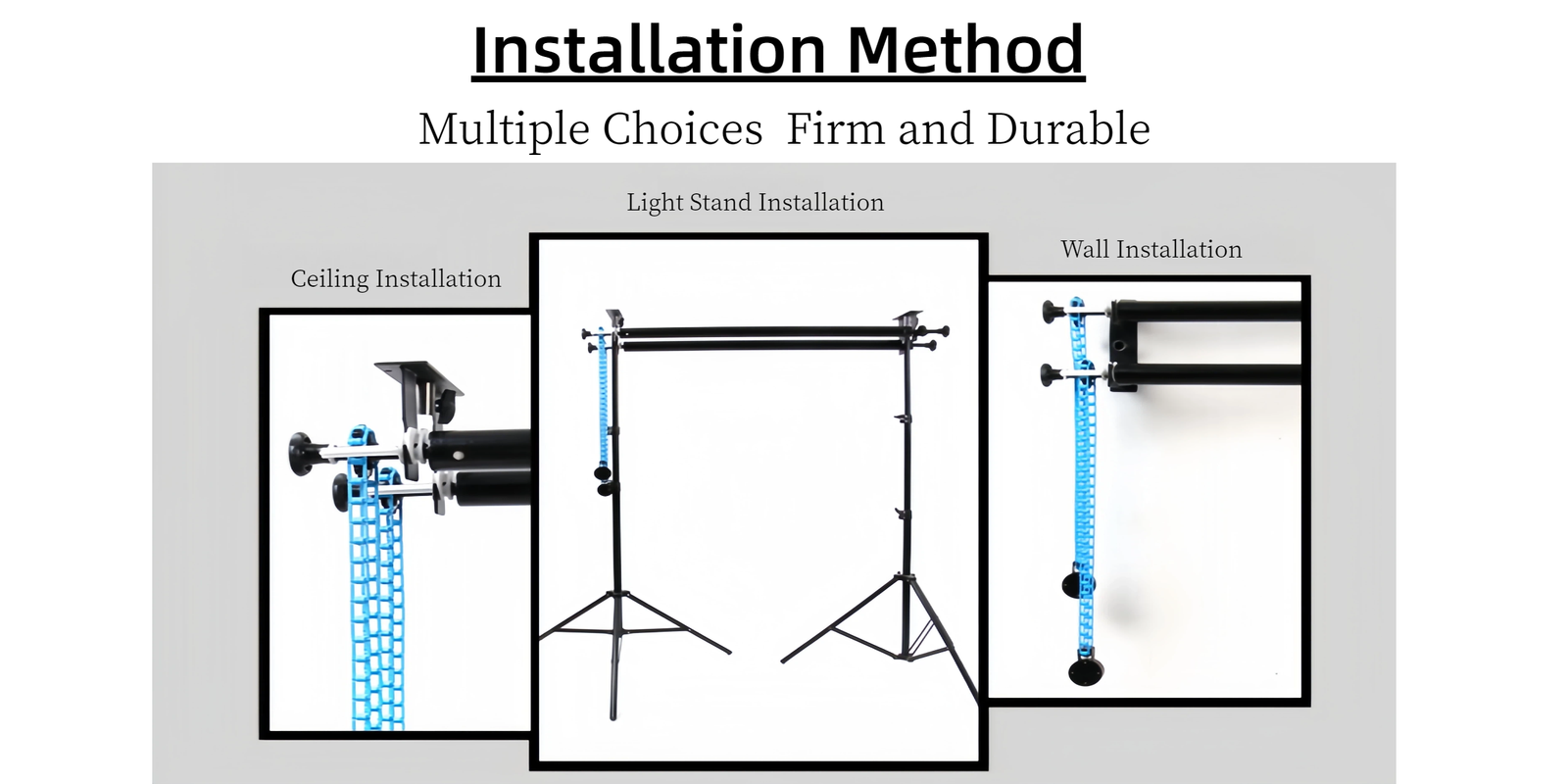 Choose from ceiling, wall, or light stand installation. This adaptability makes it perfect for studios of any size, from compact home setups to large commercial spaces.